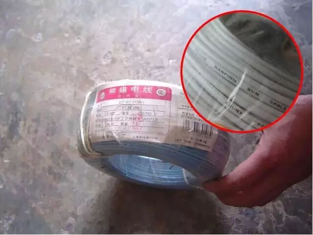 ▲電線:檢驗電線有條件的話最好用千分尺測一下線的直徑是否達到要求。在這里,編輯給大家分享一個檢驗小技巧:我們大多數家庭用的熊貓電線包裝內貼有明顯的熱敏防偽標志,用火烤一烤上面的圖文會暫時隱去。